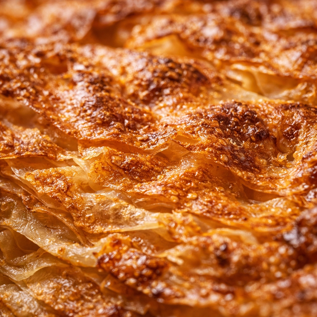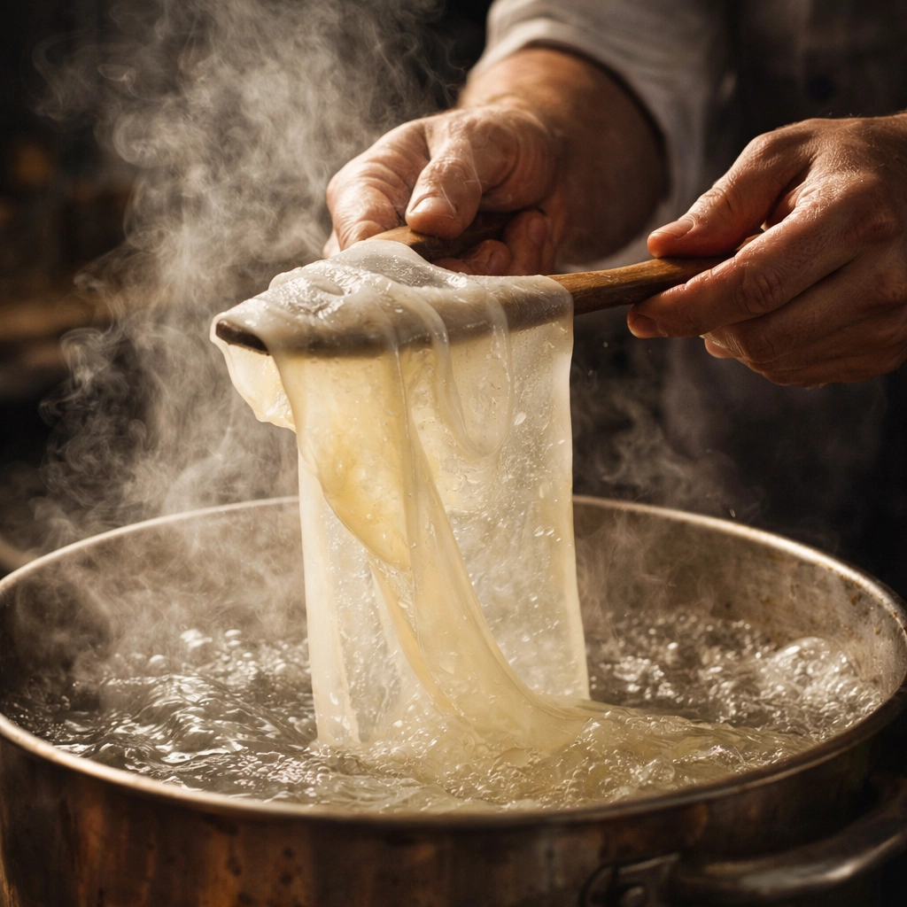 - 3. TERMAL ŞOK: HAŞLAMA VE BUZ BANYOSU (Kritik Aşama) • Geniş bir tencerede suyu fokur fokur kaynatın, tuz ve sıvı yağı ekleyin. Hemen yanına buzlu su dolu derin bir kap hazırlayın. • Açtığınız yufkalardan en düzgün olan iki tanesini ayırın (Bunlar en alta ve en üste haşlanmadan serilecek). • Kalan yufkaları tek tek kaynayan suyun içine bırakın. Suda dalgalanarak yaklaşık 1-1.5 dakika haşlanan (rengi hafif şeffaflaşan) yufkayı kevgirle dikkatlice alın ve anında buzlu suyun içine daldırın. Suyun içinde nazikçe buruşturarak soğutun, ardından elinizle fazla suyunu sıkarak çıkarın.