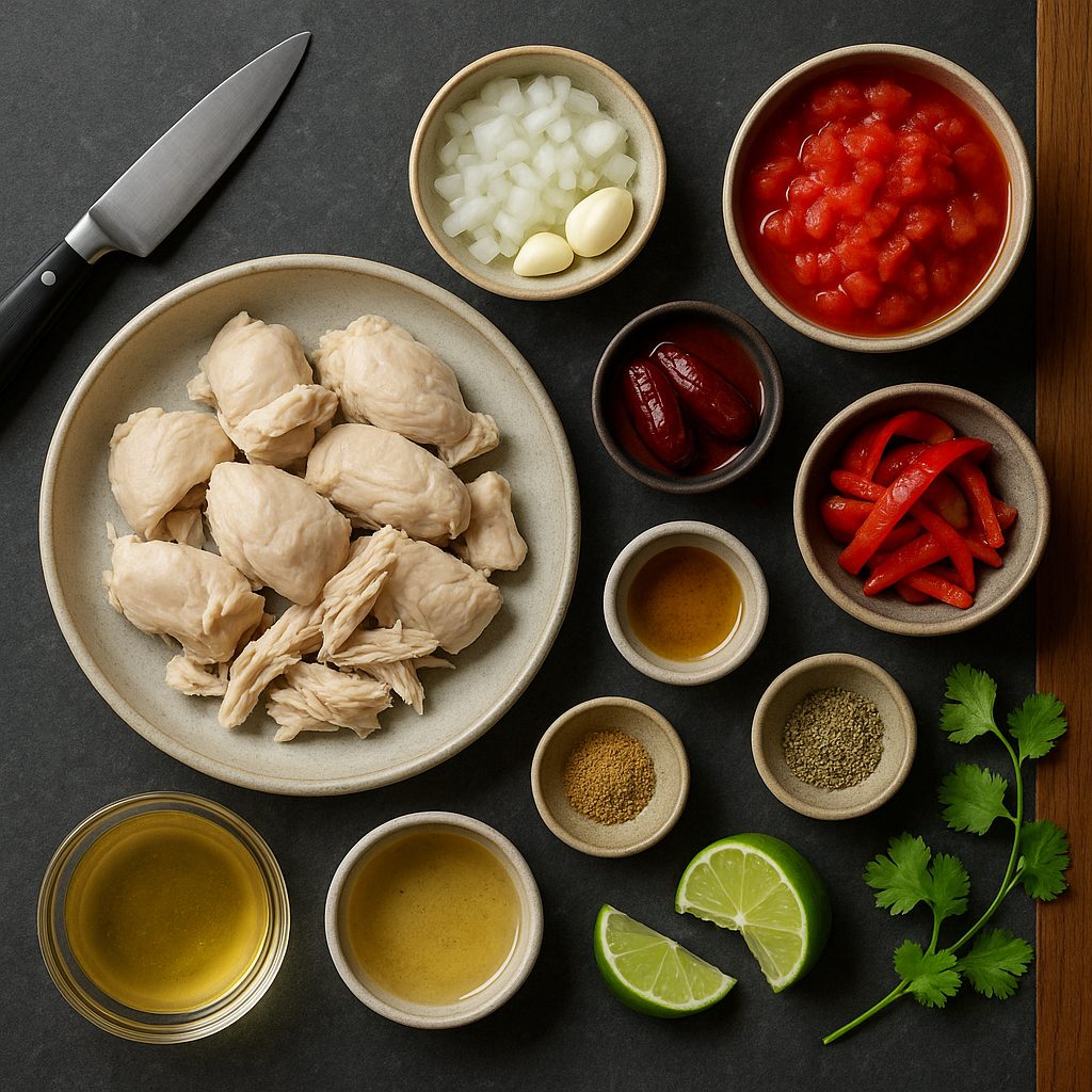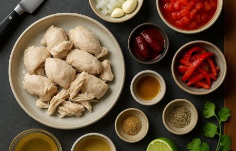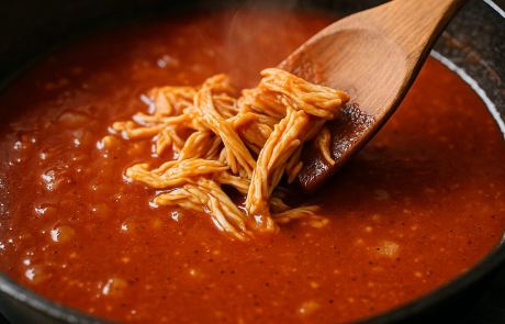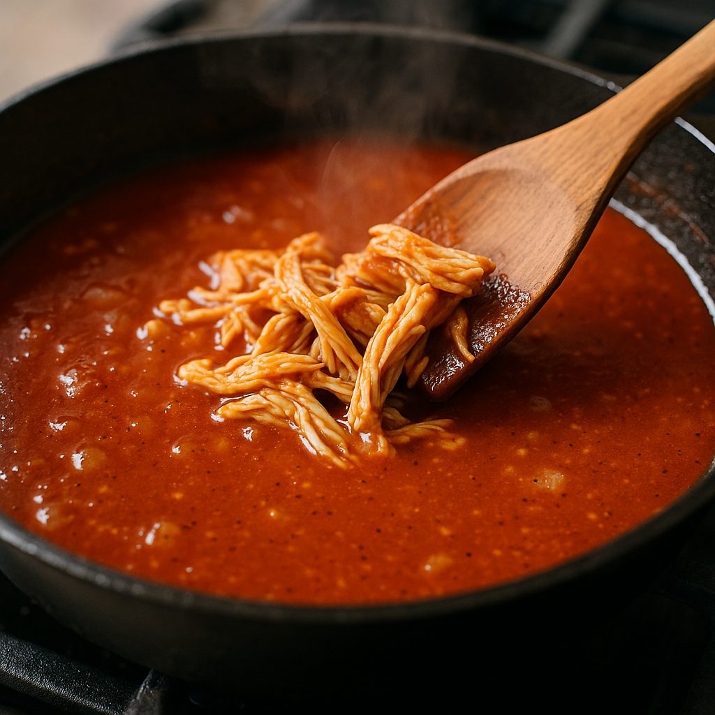 - Tavuğu birleştir: Didiklenmiş tavuğu ve sirkeyi sosun içine kat. Tuz/karabiberi ayarla. 5–8 dk daha pişir; kıvam sulu fakat parlak olsun (gerekirse biraz tavuk suyu ekle).