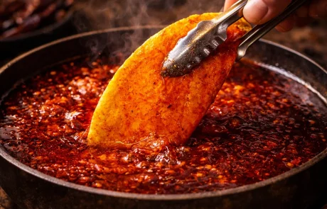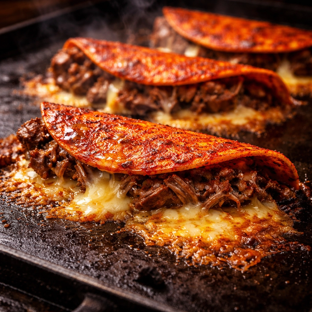 - PÜF NOKTALARI (Notes) • Yağın Mimarisi: Tortillayı suya değil, et suyunun yüzeyine çıkan yağa batırmak zorundasınız. Suya batırırsanız tortilla tavada parçalanır ve lapa olur; yağa batırırsanız tavada adeta kızararak mühürlenir ve o meşhur çıtırtıyı elde edersiniz. • Kolajen Sırrı: Bu yemeği yağsız biftekten yapamazsınız. Gerdan, incik veya kaburga gibi hareket eden kasların bağ dokusu yavaş pişmeyle erir (kolajen jelatine dönüşür) ve Consommé'ye o dudak yapıştıran yoğun, ipeksi kıvamı verir. • Peynir Dengesi: Gerçek Quesabirria peyniri tuzlu değil, süt tadı yüksek ve sünme katsayısı fazla olan bir peynir olmalıdır. Keskin/tuzlu peynirler etin baharat profilini ezer.