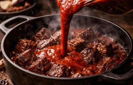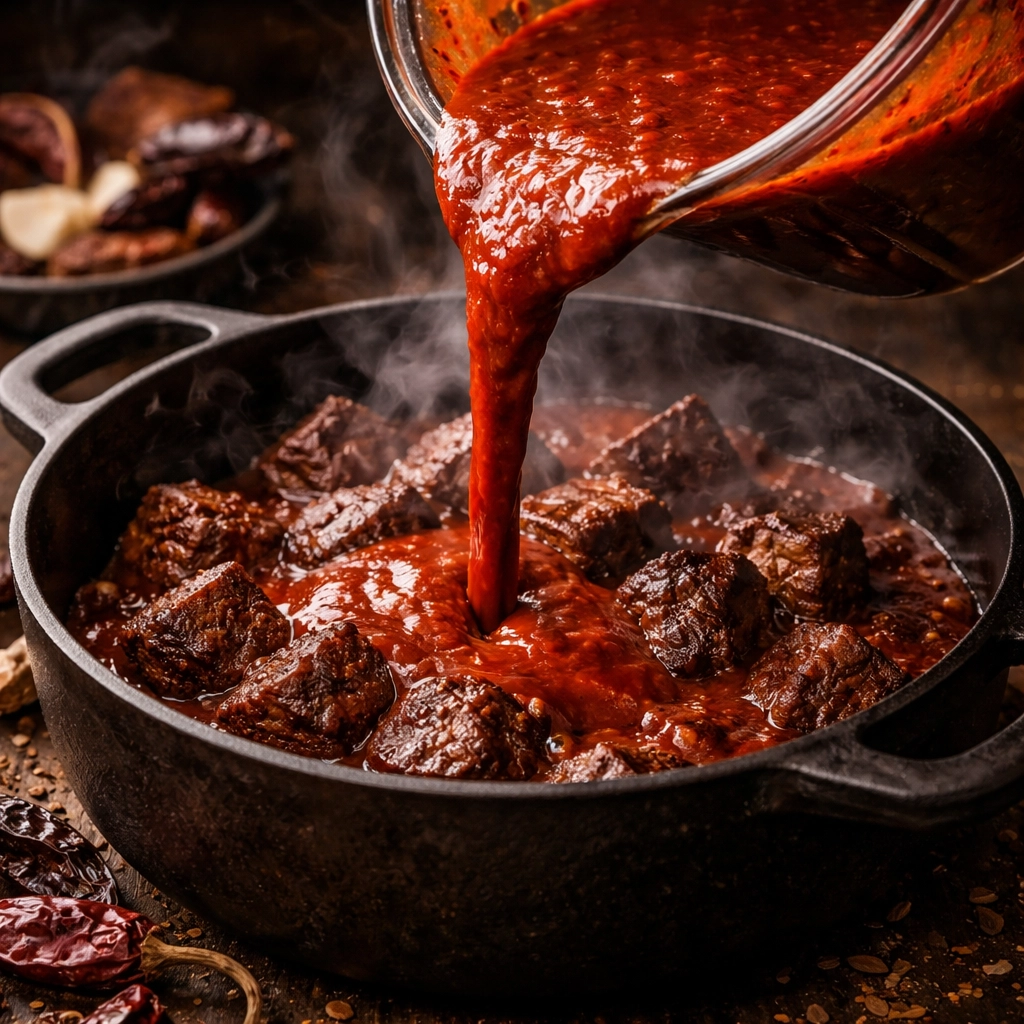 - CONSOMMÉ VE ETİN AYRILMASI • Etler piştiğinde tencereden alın ve iki çatal yardımıyla incecik didikleyin. • Tencerede kalan o muazzam kırmızı, baharatlı et suyunu (Consommé) ince bir süzgeçten geçirin. En kritik adım: Et suyunun yüzeyinde biriken o kırmızı yağ tabakasını bir kepçeyle alın ve ayrı, geniş bir kaseye ayırın. (Tacosu çıtırdatacak olan sihir bu yağdır).