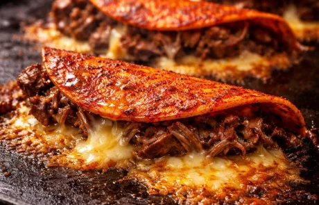 - QUESABIRRIA MONTAJI (Tirit İllüzyonu) • Düz bir döküm tavayı veya ızgarayı orta ateşte ısıtın. • Mısır tortillalarını, ayırdığınız o kırmızı baharatlı et yağına tamamen daldırıp çıkarın (Tortilla kıpkırmızı olmalı) ve sıcak tavaya koyun. • Tortillanın üzerine bolca eriyen peynir ve didiklenmiş et koyun. Peynir erimeye başladığında tortillayı ikiye katlayıp yarım ay şekli verin. Dışı nar gibi kızarıp hafifçe çıtırlaşana kadar iki yüzünü de pişirin.